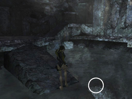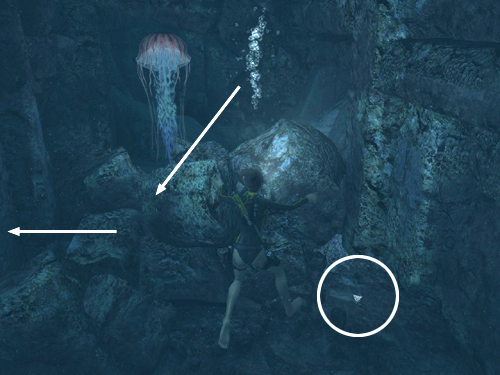 Swim forward through the rectangular doorway. Ahead on the right you'll see another pedestal, this one empty. It was probably made to hold the handle that was already in place when you arrived. Turn around so the pedestal is behind Lara. Then swim through the opening above the pile of rocks straight ahead. In the area beyond, there are 3 jellyfish. The treasure (3/26) is below and to the right of them. Take it and swim out the way you came.