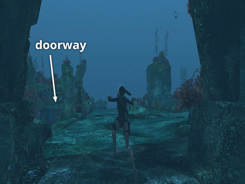 If you're not interested in treasures and want to go straight to the second handle, turn around and swim out through the door where you entered. When Lara is just outside the door facing out along the sea floor, ahead and a bit to the left you'll see an overgrown mound with a small, rectangular doorway (shown in this screenshot). That's where you're headed. Skip down to the section SECOND DOOR HANDLE, below.