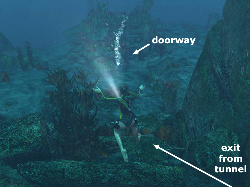 Continue upward and out of the tunnel. As you emerge on the sea bottom, turn right and swim toward the overgrown mound with the small, rectangular doorway (shown in this screenshot).