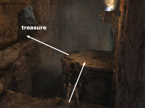 If Lara falls into the pit before getting the treasure, climb back up to the small ledge using the step on the back of it. Once you have the treasure, continue along the hallway.