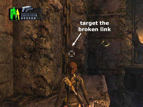 When you shoot the first weak link, the chain breaks and the spiked platform shifts a bit but does not fall. Repeat the process for the weak link on the other chain. This causes the spiked platform to drop straight onto the ugly beast below, killing it and revealing the exit from this area. When the cut scene finishes, press the precision aim button again to return to the normal view.