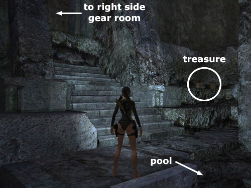 Swim to the right side of the pool (i.e., right when Lara's back is to the exit from this area) and climb out of the water on the partially submerged stairs. On the landing, in waist-deep water, is another treasure (16/26). (Check this screenshot if you need a visual.)