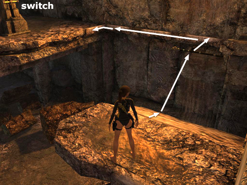 First, go to the little alcove to the right of the switch, where one of the chains used to be. Stand on the edge of the hole where the chain passed through the floor. (Don't worry; it's solid.) Face left toward the square support column with the handhold on the front. Jump toward the column. Then, just as Lara touches it, press Jump again to spring back toward the wall behind her. Quickly press Jump again to leap from the wall and grab the handhold on the column. (This series of screenshots shows the whole sequence.) Jump straight up to grab the ledge above. Pull up and go to the back of the alcove. There you'll find several ceramic jars. Smash the rounded one and take the treasure (15/26).