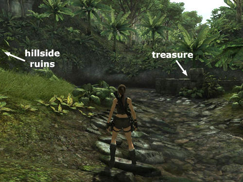 WIDE ROCK LEDGE WITH TREASURE: If you're not interested in collecting treasures, skip this paragraph and continue along the overgrown path. Otherwise, look ahead and to the left. Down below you can see the boat and, a bit closer, a wide, flat ledge with something sparkly lying in plain sight. Take a running jump from the path to clear the wide gap and land on the ledge (as shown in this screenshot). This is quite a long jump, but if you roll as Lara hits the ground, she'll take little or no damage. Pick up another treasure (4/30).