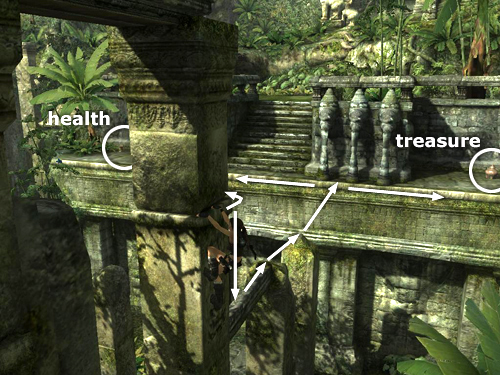 YET ANOTHER TREASURE HUNT: Climb onto the ledge on the left side of the stairs leading up to the temple. (This set of screenshots shows the longer but safer path to the treasure.) Follow the ledge around to the right, jump to grab the horizontal pole, swing and jump to the opposite ledge. Turn left and go to the end of the ledge. Look down to spot the waterfall that feeds the stream below. Above the pool, two horizontal poles protrude from the wall. This is where you're headed.