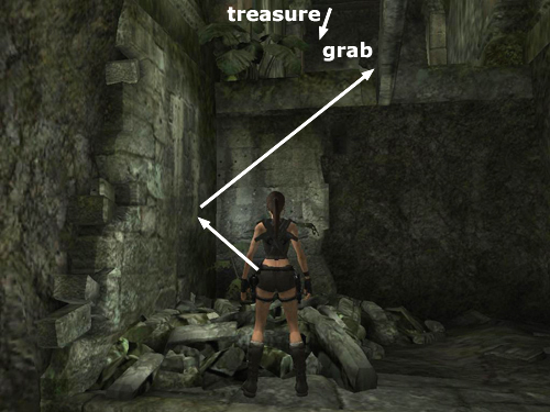 Step out onto the flat, sunny rock ledge. Kill a couple more small spiders and then turn back to face the opening from which you just emerged. Beyond the gap on the right there are two man-made handholds on the wall. Take a running jump to grab the lower of these handholds. Jump up to grab the one above and then jump again to pull up onto it. Press the direction key that causes Lara to lean away from the wall (i.e., Left if the camera is on Lara's left looking straight into the alcove) and then jump in that direction to grab the handhold ahead. Jump straight up twice to grab the ledge above and pull up. (See these screenshots if you need clarification.)