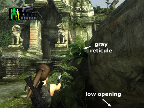 If you prefer a less confrontational approach, here are a couple of alternatives: First, when pulling up into the low opening, move forward slowly and stop as soon as Lara stands up. Then creep forward just a little more, turn right, draw pistols and hold Target Lock to aim at one of the tigers near the ruins (as shown in this screenshot). Now start firing. Even though the targeting reticle remains gray, some of your shots will connect, and eventually the tiger will fall. You'll know it's dead when the gray reticle disappears. When the first tiger dies, the second will charge across the courtyard from it's spot on the high wall opposite the opening where you pulled up. Andy M. suggested sidestepping to allow the charging tiger to run off the ledge. I didn't have too much luck with this, but I found that if you crouch and move back under the tree branch (as shown in this screenshot), the tiger can't reach Lara, and you can easily kill it with pistols. Now move out into the open and you'll only have one tiger to fight.