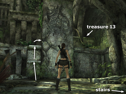 Climb the rough handholds on the square column as you did before getting treasure #13. Before jumping across to the ledge, shoot any stray spiders lurking there. Then repeat the jump with saving grab and pull up onto the ledge next to the one where you got the treasure.