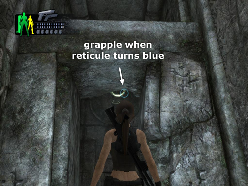 LEAVING THE GRAY STONE HALLWAY: When facing out across the second pit, you can see 2 metal rings: one mounted just under the archway ahead, the other at the center of the circular carving on the far wall. You can't grapple the second ring from here, but you may be able to reach the first one using Precision Aim. Press Z on the PC or click the right stick (R3) on the PS3/Xbox to enter Precision Aim mode. Then aim at the metal ring. When the reticle turns blue (as shown in this screenshot), fire the grapple. If you can't grapple the ring at first, try adjusting Lara's position so she's standing at the edge of the pit with a good view of the ring. Once the grapple is anchored, swing across the pit to the other side and proceed to the exit.