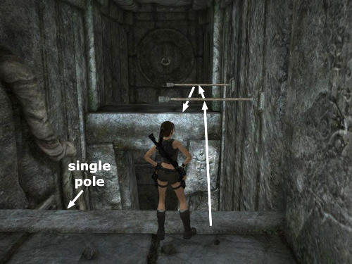 DEEP PIT WITH JUTTING BEAMS AND HORIZONTAL POLES: To cross the pit, begin by jumping to the first horizontal stone handhold on the left wall. Climb to the end and jump to grab the next handhold to the right. Climb to the right until Lara is hanging above a horizontal beam that spans the width of the pit. Drop down onto it and walk across to the other side. Turn left and jump to the broken beam ahead. Turn left and walk to the end of the beam. Jump forward and to the right to grab the higher of the two stone handholds on the opposite wall. Climb to the right and jump straight up to grab the horizontal pole.