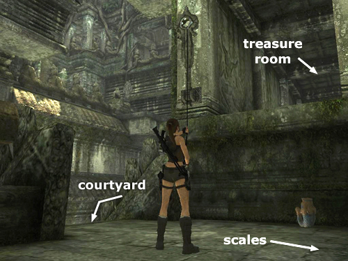 RIGHT ARM BALANCE PUZZLE: Go forward and step onto the raised platform that is part of a large balance scale. Lara's weight lowers the platform, operating a mechanism that lowers one of the Shiva statue's right arms.