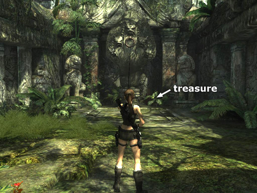 TREASURE IN FAR LEFT CORNER OF RUINS: Turn around and pick up the health potion in the bushes just ahead. Then head toward the other side of the ledge, but watch out because another pair of nagas, one of each color, tries to ambush Lara from behind. If you face the alcove where you dropped down and back up toward the wall, you'll be able to see them coming.