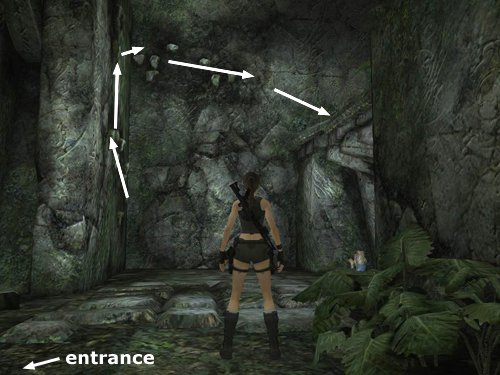 Shoot the flock of bats that attacks Lara. Then turn so the wall with the rough handholds is on Lara's left. Go forward to the wall and grab the horizontal handhold. (The following sequence is shown in this series of screenshots.) Climb to the right as far as possible and then jump the gap to grab the bottom edge of the banded wall to the right. Traverse around the corner to the right and then climb to the rough handholds on the wall above. Climb diagonally upward and to the right, then downward and right until Lara is dangling from the bottom edge of the ledge again.