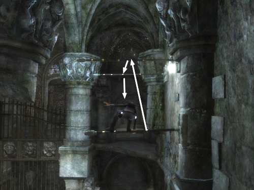 Approach the vertical pole to grab it. Climb all the way up to perch on top of it. Point the camera toward the wooden ledge at the opening of the upper tunnel and jump to land there. Follow the tunnel around to the right to an opening overlooking a large, long-disused chapel.