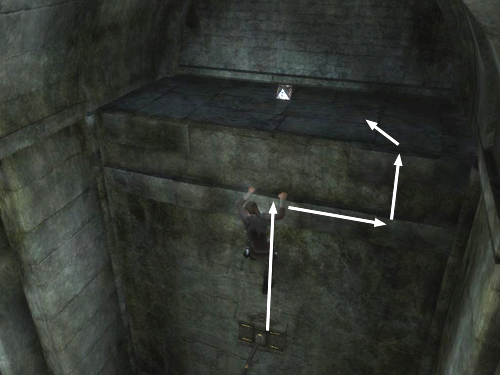 Let go of the handle. As soon as you do, the door starts to close again. Run or sprint forward, past the octagonal structure and around to the right side of the big square column near the bars. Grab the lowest handhold on the column. (There are handholds on the other side as well, but running straight from the wheel to the right side of the column is faster.) Climb up the column as far as you can go. The overhanging ledge prevents you from climbing all the way to the top.