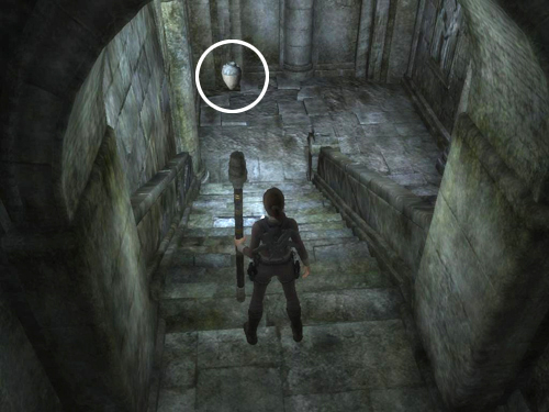 Cross to the right side of the room (i.e., right when Lara's back is to the entrance and she's facing the stone angel) to find another breakable urn containing a treasure (5/13). (This screenshot shows the spot.)