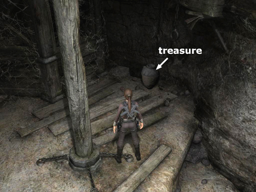 TUNNELS: The level begins in the rough, cobweb-strewn tunnel beneath the crypt. Break the large urn on Lara's right (shown in this screenshot) to find the first treasure (1/13). Vault up onto the ledge with the vertical wooden pole and you'll find another breakable jar, also containing a treasure (2/13). (Again, here's a screenshot, though it's pretty obvious.)