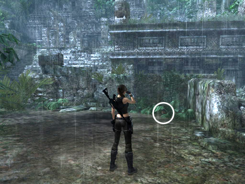 Move to the edge of the hole and step down into the slight depression to the right of the square pillar (shown in the first of these screenshots). Hang from the edge of the hole and drop to grab the narrow stone ledge below. The rain makes it slippery, so you'll have to press Interact for a saving grab to keep Lara from losing her grip. Climb all the way to the left. Then drop once more to grab the rough handholds on the wall directly below. Again tap Interact to hang on. Climb down and around to the left until Lara's back is facing the skinny vertical column. Jump back to grab it and then slide down to the floor. (Check these screenshots if you need a visual.)