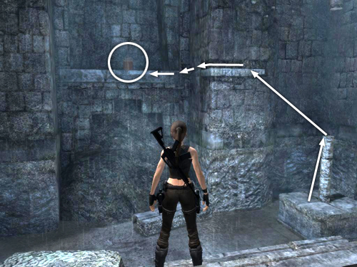 Climb along the rough handholds to the left until you can't go any farther. Jump to the left to reach the next set of handholds (just below and to the right of a carved stone orb resembling an eye). Climb down the rough wall continue climbing to the left. These handholds take you all the way around to the front of this wall, so the middle of the room is now behind Lara.