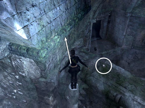 To reach the treasure (41/50) on the nearby ledge either cling to the top of the column, jump to grab the edge of the ledge and pull up, or perch on top of the column, turn toward the wall to the left of the treasure and then jump (as shown in this screenshot). Lara will hit the wall and drop safely onto the ledge. If you perch on the column and jump straight toward the treasure, Lara will overshoot the ledge and fall.