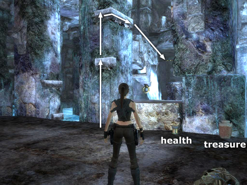 Before going on, make a few pickups around the room: There's a health potion and a breakable jar with a treasure (30/50) just to the left of the entrance (i.e., left when Lara's back is to the door).