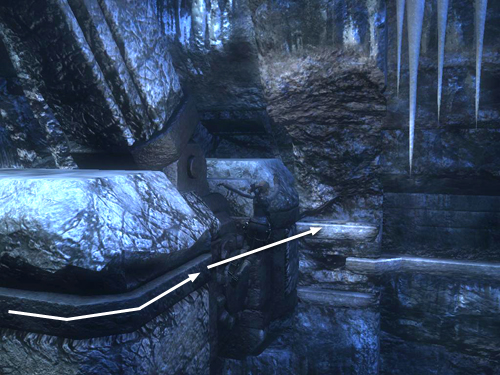 The exit from this area is beyond the ledge where the last thrall was standing. Don't go there yet, though. You've got a few more goodies to collect first.