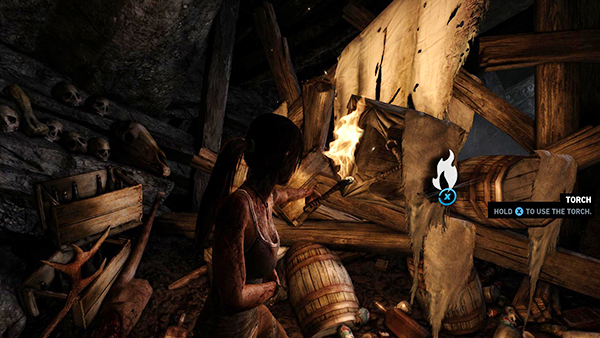 Stand near the brazier on the right and press Interact to relight your torch. Climb onto the ledge on the left and use the torch to ignite the sail wrapped around the pole. The flame spreads to the fuel barrel on the next ledge causing the barrel to explode. Drop down and climb over that ledge. When you enter the low tunnel ahead, Lara automatically crouches.