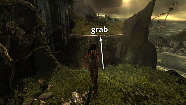 CLIMBING THE CRASHED AIRPLANE: Follow the path to a clearing with a waterfall and a crashed plane. Move around to the left and then step out onto the detached wing that forms a ledge below the dangling wreckage. Jump up to grab one of the silver bars on the nose of the plane. Here an on-screen prompt tells you to press Interact (E/Square/X) to grab when Lara starts to lose her grip. Once Lara has grabbed on again, press Up to begin climbing the fuselage. Then press Jump and Up to leap up to a higher handhold. Although the plane creaks and shudders, there's no hurry at this point. Once you have a firm handhold, Lara is safe. (screenshots)