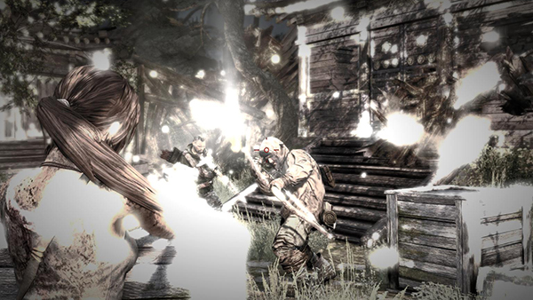 When the first man who came down the hill moves off to the left, follow the path he came down, taking cover from the next enemy behind the low wall on the left. From here you can watch the action ahead. When the guy on the left moves away, follow him and run into the ramshackle shed ahead. Move through the shed and out the other side, staying close to the stone wall on your left. Wait for the enemy on patrol there to move off and then head up the steps where he was standing and continue up the path. (screenshots)
