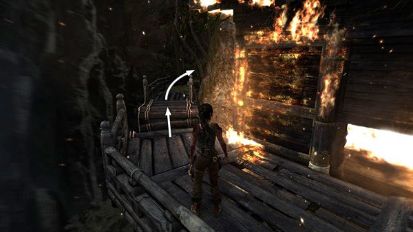 THROUGH THE FIRST BURNING BUILDING: The way back down the hill is now blocked by flaming debris. That's OK since there are no items down there anyway. Climb the steps to the building at the end of this open area and use your axe to force open the ornate wooden door. (screenshot) When you get it open, enemies arrive and attempt to burn the building with Lara inside. Cross the room and follow the on-screen prompts to press the Melee button several times in order to kick out the boarded-up opening. (screenshot) If you hesitate, Lara succumbs to the heat and smoke.