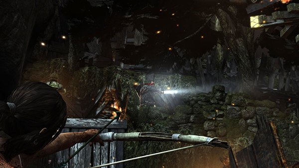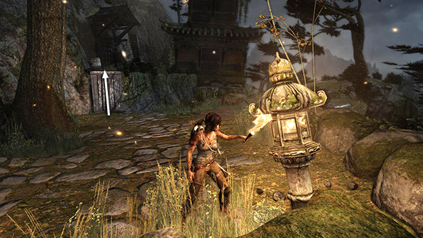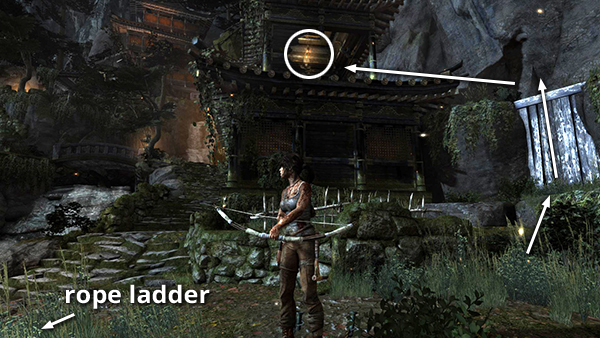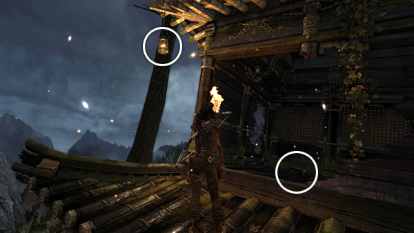Turn so the cliff is behind Lara. Shoot the lantern (1/5) in the building above to unlock the Pyromaniac Challenge. This is the first of five such lanterns you can destroy for an XP bonus. There are more arrows and a salvage crate at the base of this building. Scramble up the wooden wall on the right to get into the building itself, where you'll find a GPS cache (1/2) and more arrows. (screenshot)