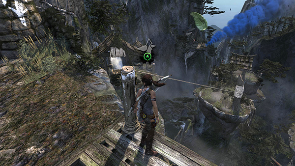 REACHING THE SMOKE BEACON: Now it's time to go after Captain Jessop. Move to the other anchor post on this little plateau and shoot a rope arrow into the arch near the parachute and smoke beacon. As you climb across, the post starts to creak a bit. Before Lara can reach the other side, it gives way and she plunges into the canyon, barely managing to hang onto the rope. As soon as you get close to the craggy rock wall, press Interact to sink your climbing axe into it. Then climb up to safety. (screenshots)