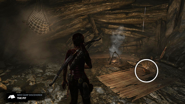 You emerge near a new Day Camp called, aptly enough, The Pit. There's a salvage net hanging near the campfire, as well as a document (1/3), "In Her Honor," from the Confessions of a Solarii set, and another small bunch of arrows. (screenshot) When you rest here, you'll also unlock another entry in Lara's Journal (6/10).