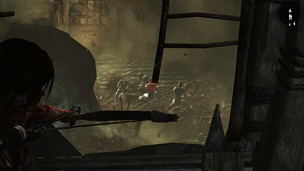 Sneak up the steps where the third man went. He's sitting in the well-lit area ahead playing checkers with another soldier. Grab the arrows leaning against the wooden wall and watch the men. After a moment, without your doing anything, the spotlight burns out. The man on the right goes to investigate, while the demo man remains seated. Take him out with a silent headshot. Then do the same to the other man while he hunches over the spotlight. If you don't kill him quickly, you may still be able to hit him before he starts yelling, but if either of them notices Lara, he'll call out for help. Then you'll need to fight a bunch of men at once. Likewise, do not ignite the gas near the guys playing checkers. This will also bring in more enemies. (screenshots)