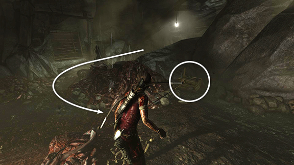 As soon as Lara hears the oncoming enemies, she'll go into a defensive crouch. Grab the 3 bundles of arrows leaning against the wooden fence in the middle of the tunnel. Then hurry around to the right to hide from the men. They'll have a little conversation. Then one will return to the area farther up the tunnel, and one will head down to the pit to check on the valve you just destroyed. The third will stand on the other side of the rock formation for a nice, relaxing pee. While he's relieving himself, you can kill him with a silent headshot or sneak around behind him and use a melee attack. He makes quite a bit of noise if you hit him with the axe, but the other men don't seem to notice. Sometimes you've just gotta go that badly.