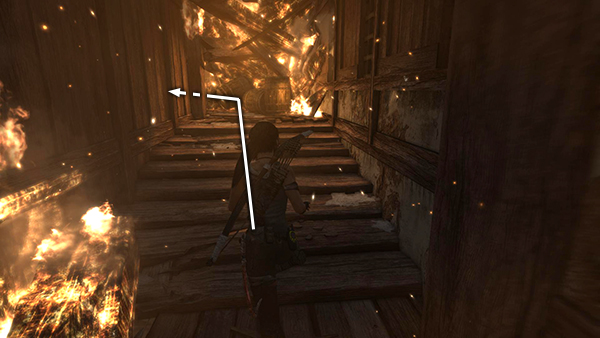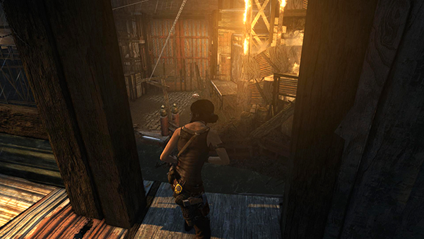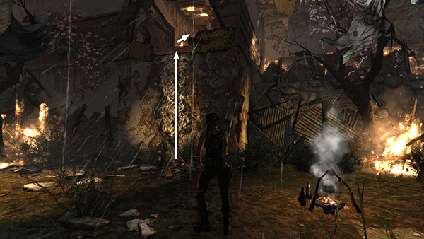 Move forward (southwest) along the only clear path across the rooftop. Turn right at the corner, continue forward and ride the zip line down to the next roof. Another explosion billows out of the doorway ahead. As it subsides, take cover behind the low wall on the outside edge of the walkway because a pair of Solarii start shooting and throwing dynamite from the building across the way to the south—the one with the rough climbing wall. When you've taken care of them, search the bodies on this side of the gap, pick up 2 bunches of arrows in the corner. Then take a running jump across to the building where the shooters were. It's a long jump, so prepare to press Interact to steady Lara's grip on the opposite ledge. Use your axe to scale the climbing wall, loot the bodies here and then enter the building. (screenshots)