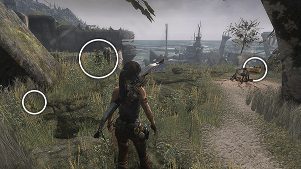 After crawling through the tunnel from Shipwreck Beach, you emerge on a wide ledge high above the sea. Lara spots the Endurance in the distance, and you discover the Bunker Vista Day Camp. Pick up the first GPS cache (1/5) near the rocks on the left, harvest the edible plant for XP and crack open the salvage crate. (screenshot)