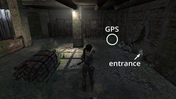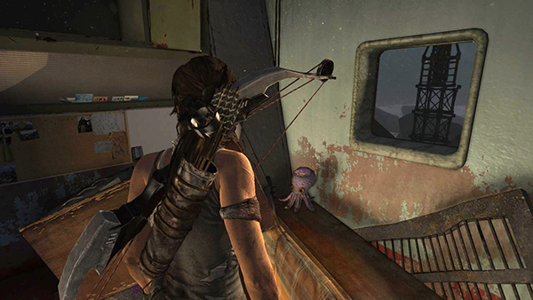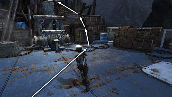 When Lara puts her weapon away, you'll know the area is clear for the moment. Loot the bodies on this side of the room and then move to the end of the walkway and jump across the gap. When you enter the room on the left, another bad guy appears behind you on the upper level. Turn around and take him out from the doorway. Then crack open the salvage crate and pick up 2 bundles of arrows, rifle/SMG ammo and shotgun shells. (screenshots)