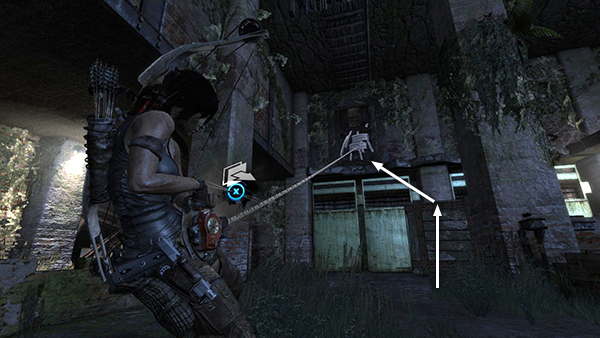 Exit the cabin, turn left and continue down the hallway. Lara overhears 2 of Mathias's men talking. Move forward and take out the first one in the doorway. The second is ahead and below, in the other section of the broken ship. Shoot him, pick up the arrows leaning against the support column, and then slide down the zip line.