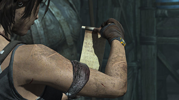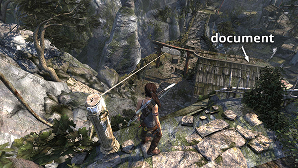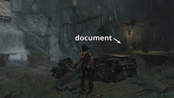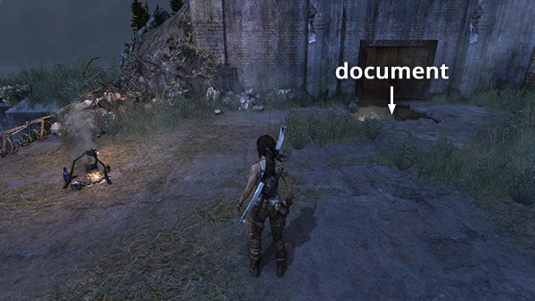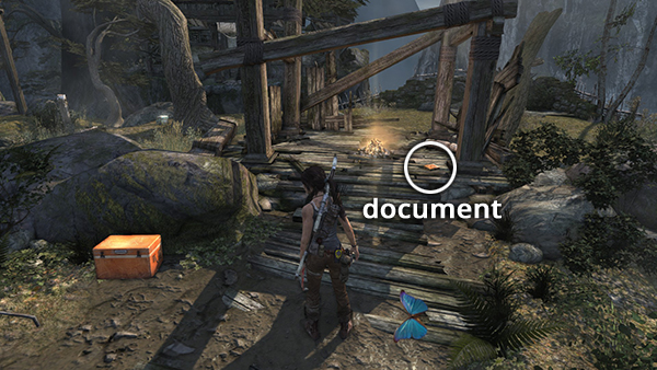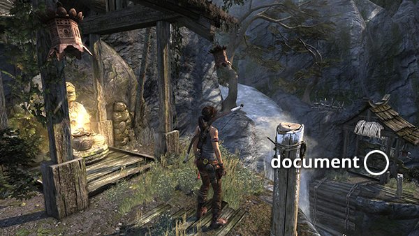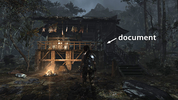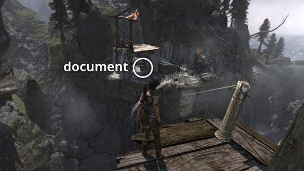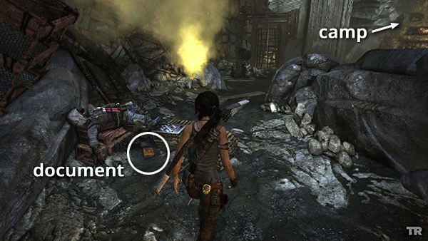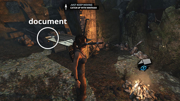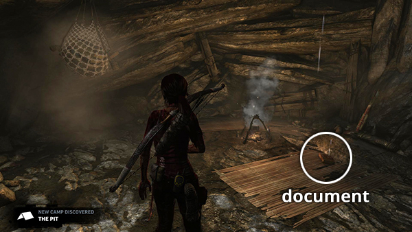 Unlike the other documents which appear in the game world as physical books which must be picked up and examined, Lara makes entries in her journal when she rests at various base camps. When she sits down at a camp, you'll hear her talking about what's going on. Afterward, these musings are stored in the Documents screen so you can review them. Lara's journals are not marked on the level maps and are not counted in the total number of documents on each level's map key.