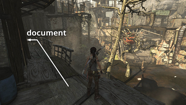 This is document #2 on the part 1 map. It's located in one of the shacks near the middle of the first area, below Helicopter Hill. If you enter the building shown in the screenshot and blast through the wooden barrier, you'll find this document in the next room on the upper level. See here for details. (Click screenshot to enlarge.)