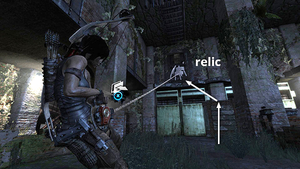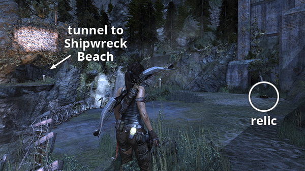 This is relic #1 on the level map. It's in the tunnel leading into the base from Shipwreck Beach. After climbing down to the stream bed, use explosive arrows or grenades to blow open the metal barriers and access the relic. See here for details. If you're out of grenades, see this tip in the Guide to 100% Completion. (Click screenshot to enlarge.)