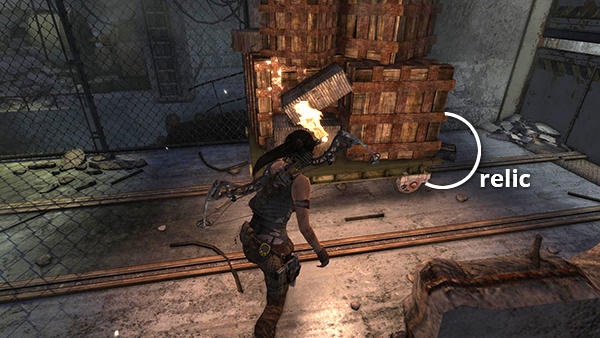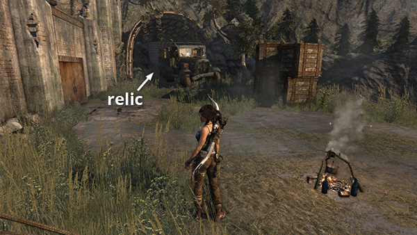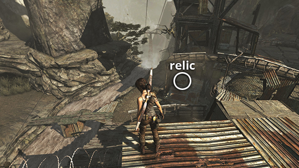 This is relic #2 on the part 1 map. It is found in one of the little shacks on the west side of Shantytown. As you leave the building containing the entrance to the Well of Tears Challenge Tomb, go down the steps and look for the shack on the left with a boarded-up doorway. Shoot out the planks and enter to find the relic. See here for details. (Click screenshot to enlarge.)