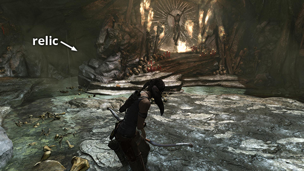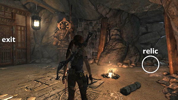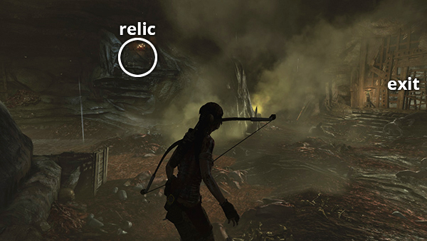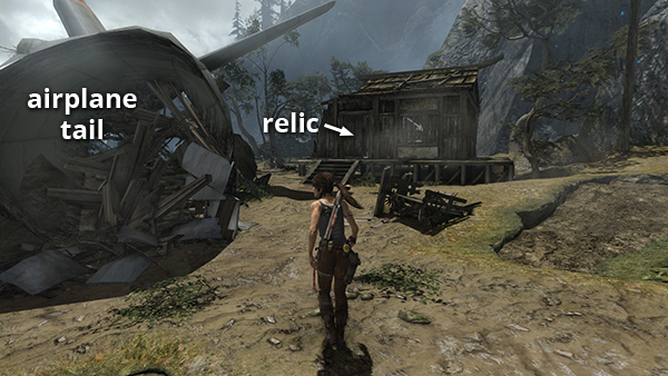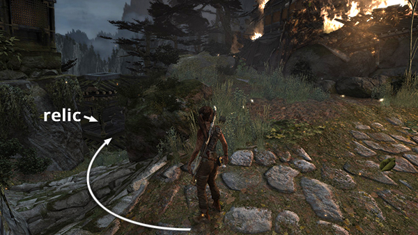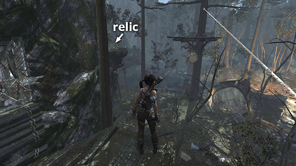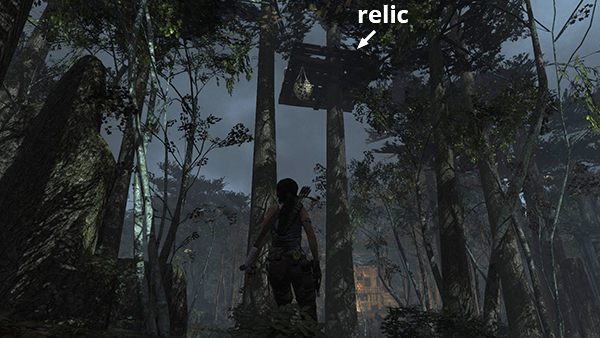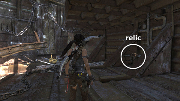 This relic is #3 on the second visit map. It is located in the wooden house below the Village Overlook Base Camp and is not accessible until the second visit to Mountain Village. See here for how to reach that area the first time or here for how to reach it after completing the Mountain Village level. (Click screenshot to enlarge.)