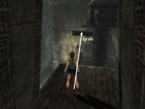 POSSIBLE FIXES FOR GRAB BUG IN LEFT SIDE OF TEMPLE: A number of players have encountered a bug in which Lara will not grab the ledge in front of the passageway with the ramp. Perhaps this will addressed in a forthcoming patch, but in the meantime, here are a few suggestions other players have shared with me: