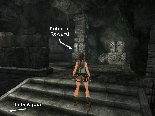 In the Nintendo Wii game, you'll find a RUBBING REWARD (1/12), titled "Soul of the Puma," on this landing. If Lara is standing at the top of the lower flight of steps with her back toward the village, the panel with the carving is ahead on the left. (The spot is indicated in this screenshot.) Approach it and press Interact. Then hold the A button and swish the Wii remote to brush away the dust. When the carving is clean, the tools automatically change to paper and charcoal. Use the same controls again to make the rubbing. Later, when you revisit Croft Manor, you'll see this rubbing on display. (See the Croft Manor walkthrough for details.)