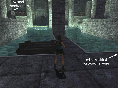 CISTERN – MIDDLE LEVEL: If you dive into the water from above, immediately swim away from the 2 crocodiles to the edge of the pool opposite the wooden fence with the metal bars (i.e., near where the second crate landed when you pushed it off the ledge above). The edge is low enough for Lara to climb out here. If one of the crocs manages to grab Lara, alternate tapping the Left and Right direction keys (or wiggle the left analog stick from side to side) to break loose. Then swim away, climb out of the water and shoot the crocs from dry land. Note that you can still hit them with pistols even if the targeting reticle is gray instead of red. It just takes a little longer. Using manual aim may help.