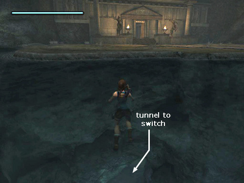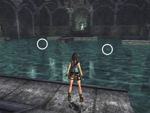 CISTERN EXIT: To reach the exit, swim to the square walkway surrounding the balcony. It's too high for Lara to pull up, so swim through the gap in the walkway and climb out on the small wooden platform you moved earlier.