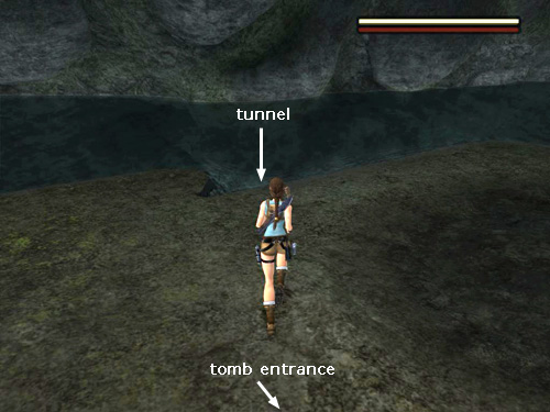 ARTIFACT #2: Hop back into the pool and face the ledge where you just found the ammo so the tomb entrance is behind Lara. Swim down and to the right to find another underwater tunnel. It's probably a good idea to locate the tunnel first then swim to the surface to breathe. Position Lara on the surface just above the tunnel, then swim down and into the tunnel to get ARTIFACT #2 (26/44). There's no place to surface so quickly swim back to the big pool. (These screenshots show the location of the tunnel.)