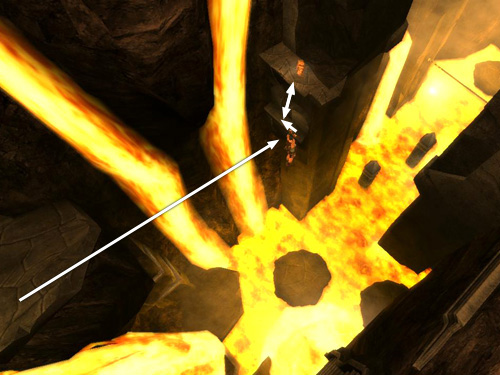 From there, jump back to grab one of the handholds on the square column beyond the double lava falls. Take care not to jump too close to the falls. The middle of this small ledge is a good take-off point. Climb around the corner to the right and drop down twice to reach the ledge below.
